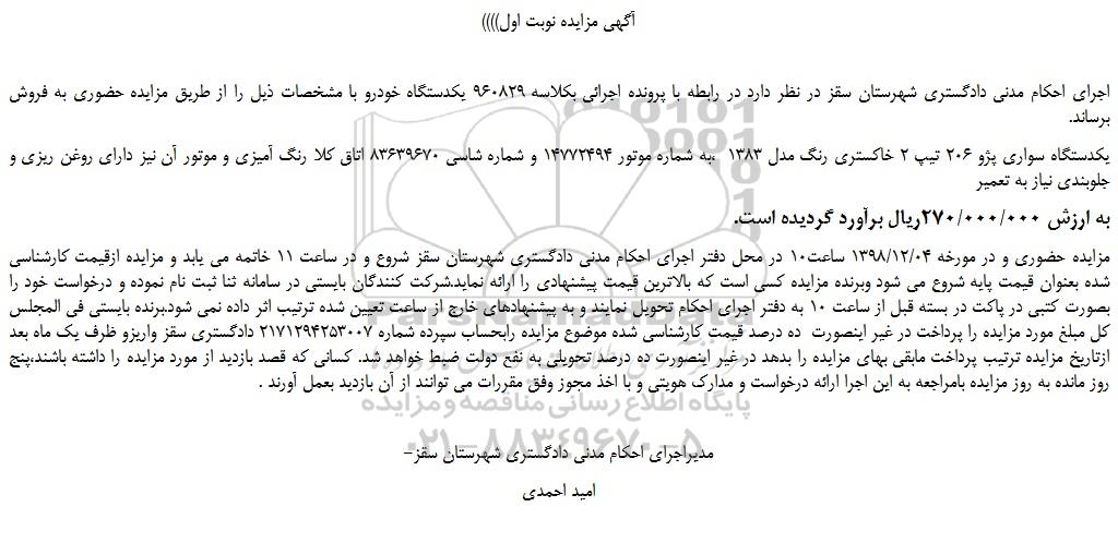 اجرای احکام مدنی دادگستری شهرستان سقز در نظر دارد در رابطه با پرونده اجرائی بکلاسه 960829 یکدستگاه خودرو با مشخصات ذیل را از طریق مزایده حضوری به فروش برساند.