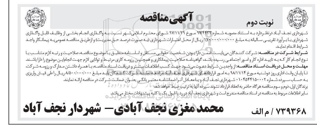 شهرداری نجف آباد در نظر دارد نسبت به واگذاری انجام بخشی از وظایف قابل واگذاری شهرداری با برآورد تقریبی سالیانه به مبلغ 170.000.000 ریال از محل اعتبارات شهرداری به صورت درصد حق مدیریت و از طریق مناقصه عمومی به پیمانکار واجد شرایط اقدام نماید