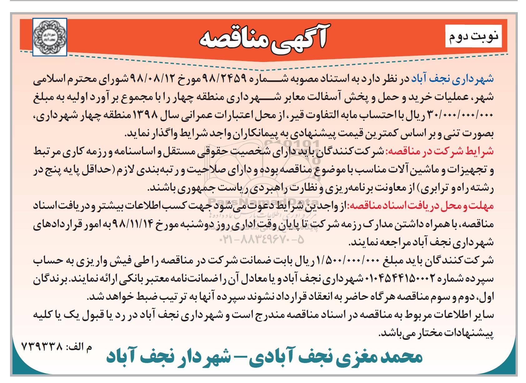 شهرداری نجف آباد در نظر دارد عملیات خرید و حمل و پخش آسفالت معابر شهرداری منطقه چهار را با مجموع برآورد اولیه به مبلغ 30.000.000.000 ریال با احتساب مابه التفاوت قیر، از محل اعتبارات عمرانی سال 98 منطقه چهار شهرداری بصورت تنی و براساس کمترین قیمت پیشنهادی به پیمانکاران واجد شرایط واگذار نماید.