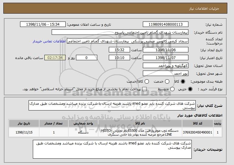 نام دستگاه خریدار:بیمارستان شهدای گمنام تامین اجتماعی یاسوج