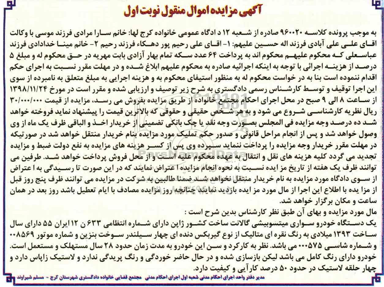 مورد مزایده فروش یکدستگاه خودرو سواری میتسوبیشی گالانت مدل 1393 میلادی