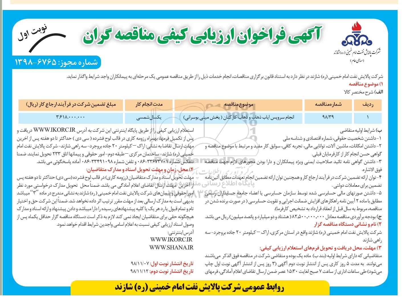 شرکت پالایش نفت امام خمینی (ره) شازند در نظر دارد انجام خدمات ذیل را از طریق مناقصه عمومی یک مرحله ای به پیمانکار واجد شرایط واگذار نماید.