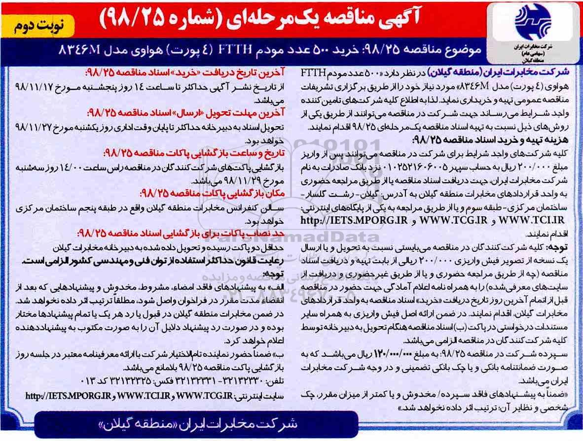 شرکت مخابرات ایران منطقه گیلان در نظر دارد خرید 500 عدد مودم FTTH (چهار پورت) هواوی مدل 8346M مورد نیاز خود را از طریق برگزاری تشریفات مناقصه عمومی تهیه و خریداری نماید. لذا به اطلاع کلیه شرکتهای تامین کننده واجد شرایط می رساند جهت شرکت در مناقصه می توانند از طریق یکی از روشهای ذیل نسبت به تهیه اسناد مناقصه یک مرحله ای 98/25 اقدام نمایند