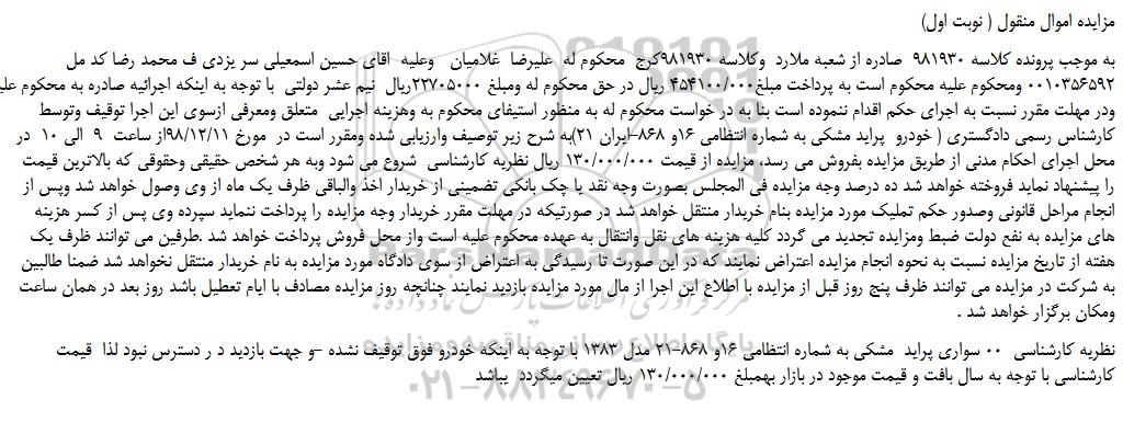به موجب پرونده کلاسه 981930  صادره از شعبه ملارد  وکلاسه 981930کرج  محکوم له  علیرضا  غلامیان   وعلیه  اقای حسین اسمعیلی سر یزدی ف محمد رضا کد مل 0010356592 ومحکوم علیه محکوم است به پرداخت مبلغ454100/000 ریال در حق محکوم له ومبلغ 22705000ریال  نیم عشر دولتی  با توجه به اینکه اجرائیه صادره به محکوم علیه ابلاغ شده ودر مهلت مقرر نسبت به اجرای حکم اقدام ننموده است بنا به در خواست محکوم له به منظور استیفای محکوم به وهزینه اجرایی  متعلق ومعرفی ازسوی این اجرا توقیف وتوسط کارشناس رسمی دادگستری ( خودرو  پراید مشکی به شماره انتظامی 16و 868-ایران 21)به شرح زیر توصیف وارزیابی شده ومقرر است در  مورخ 98/12/11از ساعت  9  الی 10  در محل اجرای احکام مدنی از طریق مزایده بفروش می رسد، مزایده از قیمت 130/000/000 ریال نظریه کارشناسی  شروع می شود وبه هر شخص حقیقی وحقوقی که بالاترین قیمت را پیشنهاد نماید فروخته خواهد شد ده درصد وجه مزایده فی المجلس بصورت وجه نقد یا چک بانکی تضمینی از خریدار اخذ والباقی ظرف یک ماه از وی وصول خواهد شد وپس از انجام مراحل قانونی وصدور حکم تملیک مورد مزایده بنام خریدار منتقل خواهد شد در صورتیکه در مهلت مقرر خریدار وجه مزایده را پرداخت ننماید سپرده وی پس از کسر هزینه های مزایده به نفع دولت ضبط ومزایده تجدید می گردد کلیه هزینه های نقل وانتقال به عهده محکوم علیه است واز محل فروش پرداخت خواهد شد .طرفین می توانند ظرف یک هفته از تاریخ مزایده نسبت به نحوه انجام مزایده اعتراض نمایند که در این صورت تا رسیدگی به اعتراض از سوی دادگاه مورد مزایده به نام خریدار منتقل نخواهد شد ضمنا طالبین به شرکت در مزایده می توانند ظرف پنج روز قبل از مزایده با اطلاع این اجرا از مال مورد مزایده بازدید نمایند چنانچه روز مزایده مصادف با ایام تعطیل باشد روز بعد در همان ساعت ومکان برگزار خواهد شد .