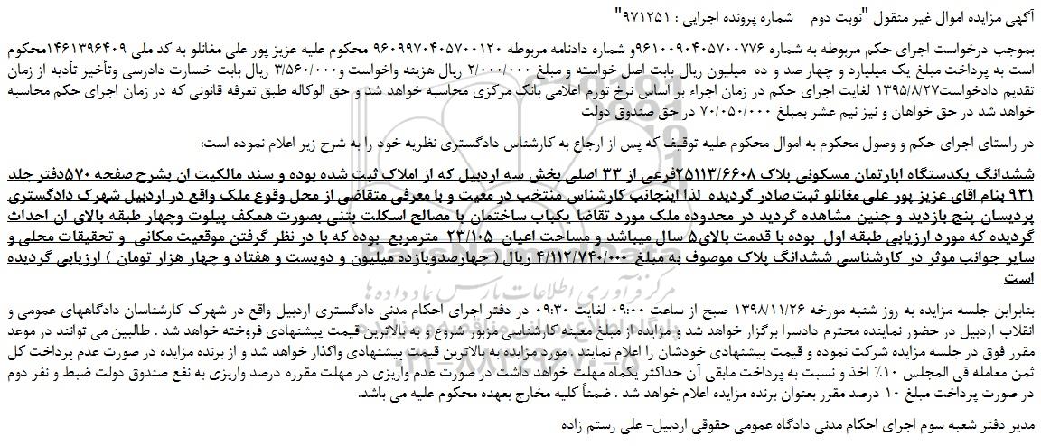 "آگهی مزایده اموال غیر منقول "نوبت دوم    شماره پرونده اجرایی : 971251