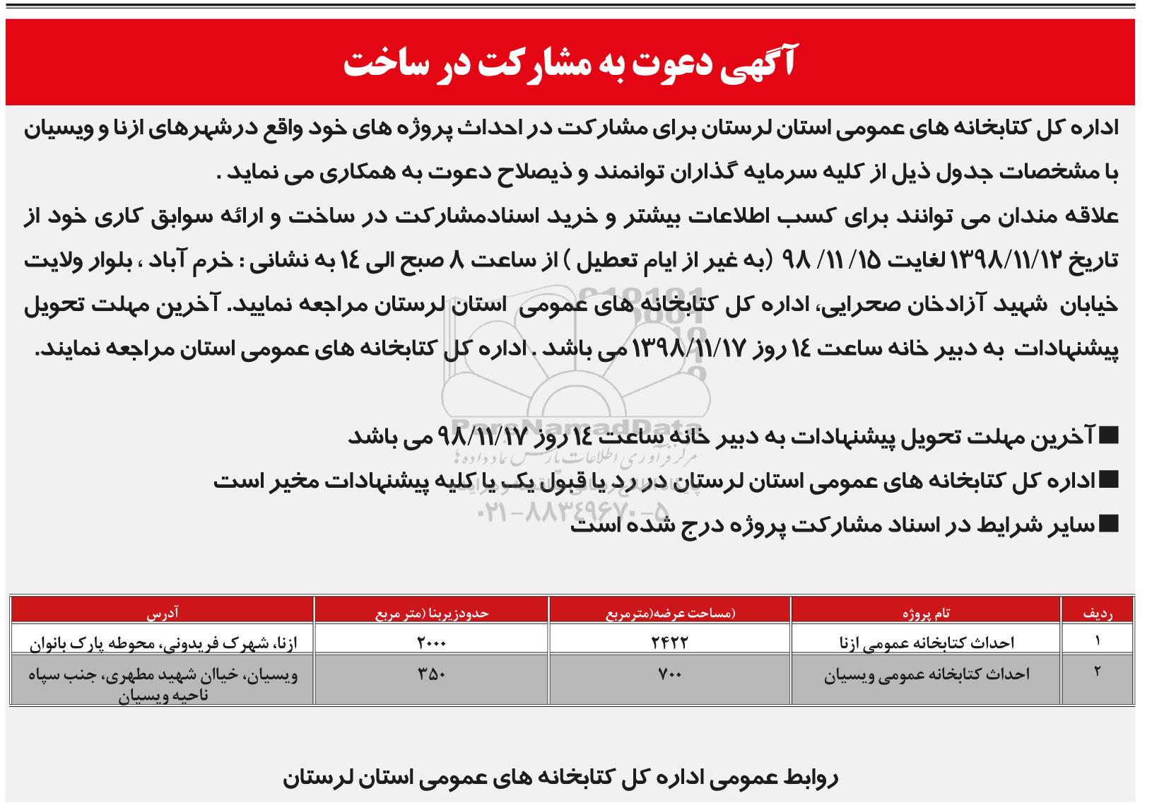 اداره کل کتابخانه های عمومی استان لرستان برای مشارکت در احداث پروژه های خود واقع در شهرهای ازنا و ویسیان با مشخصات جدول ذیل از کلیه سرمایه گذاران توانمند و ذیصلاح دعوت به همکاری می نماید.