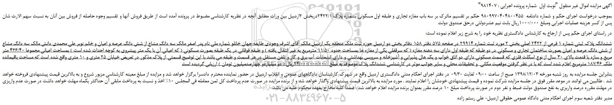 "آگهی مزایده اموال غیر منقول "نوبت اول شماره پرونده اجرایی : 981407