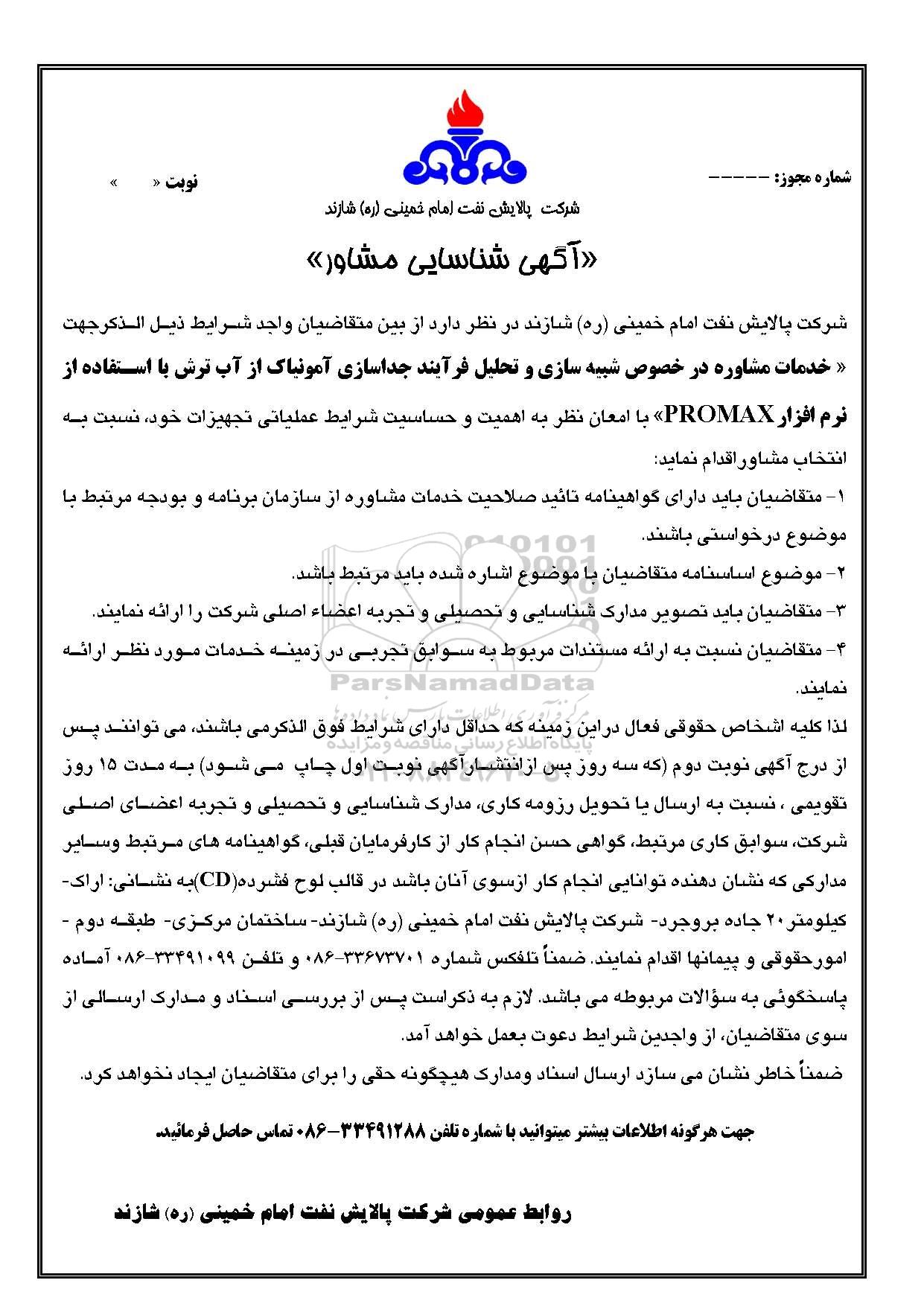 شرکت پالایش نفت امام خمینی ره شازند در نظر دارد  از بین متقاضیان واجد شرایط ذیل الذكوجهت « خدمات مشاوره در خصوص شبیه سازی و تحلیل فرآیند جداسازی آمونیاک از آب ترش با استفاده از نرم افزار PROMAX» با امعان نظر به اهمیت و حساسیت شرایط عملیاتی تجهیزات خود، نسبت به انتخاب مشاور اقدام نماید: