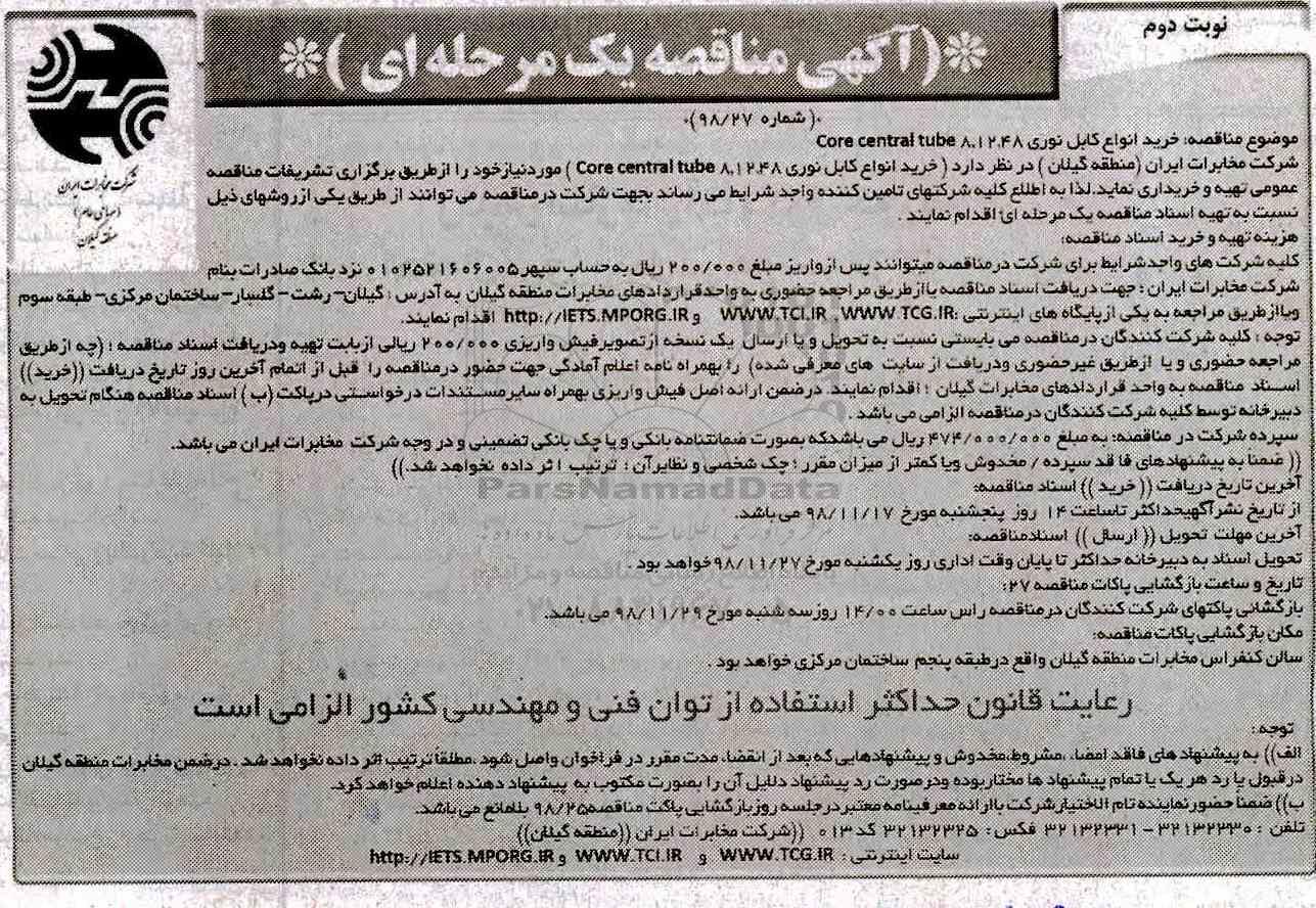 شرکت مخابرات ایران (منطقه گیلان) در نظر دارد خرید انواع کابل نوری core central tube 8،12،48 مورد نیاز خود را از طریق برگزاری تشریفات مناقصه عمومی اقدام نماید. لذا از کلیه شرکت های تامین کننده واجد شرایط دعوت به عمل می آید جهت شرکت در مناقصه و تهیه اسناد از طریق یکی از روشهای ذیل نسبت به تهیه اسناد مناقصه یک مرحله ای اقدام نمایند