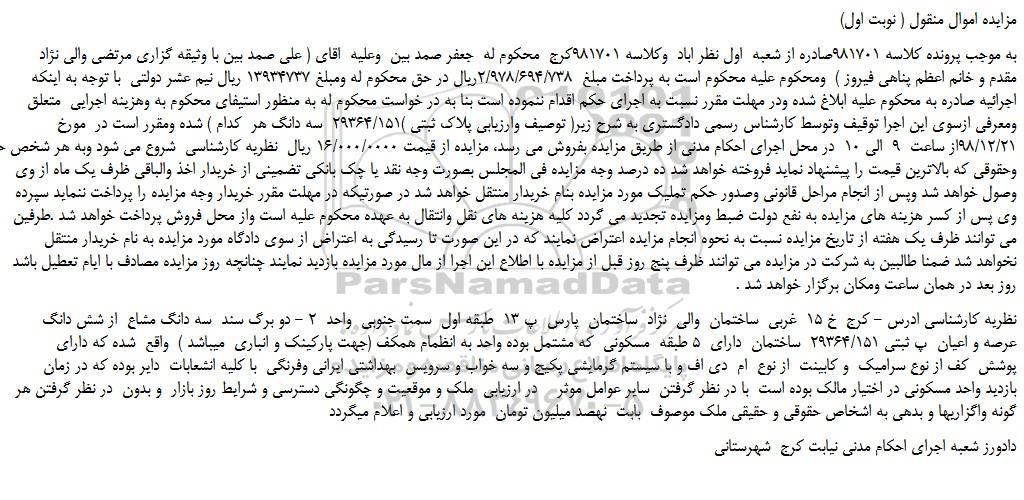 به موجب پرونده کلاسه 981701صادره از شعبه  اول نظر اباد  وکلاسه 981701کرج  محکوم له  جعفر صمد بین  وعلیه  اقای ( علی صمد بین با وثیقه گزاری مرتضی والی نژاد مقدم و خانم اعظم پناهی فیروز )  ومحکوم علیه محکوم است به پرداخت مبلغ  2/978/694/738ریال در حق محکوم له ومبلغ 13934737 ریال نیم عشر دولتی  با توجه به اینکه اجرائیه صادره به محکوم علیه ابلاغ شده ودر مهلت مقرر نسبت به اجرای حکم اقدام ننموده است بنا به در خواست محکوم له به منظور استیفای محکوم به وهزینه اجرایی  متعلق ومعرفی ازسوی این اجرا توقیف وتوسط کارشناس رسمی دادگستری به شرح زیر( توصیف وارزیابی پلاک ثبتی )29364/151  سه دانگ هر  کدام ) شده ومقرر است در  مورخ 98/12/21از ساعت  9  الی 10  در محل اجرای احکام مدنی از طریق مزایده بفروش می رسد، مزایده از قیمت 16/000/0000 ریال  نظریه کارشناسی  شروع می شود وبه هر شخص حقیقی وحقوقی که بالاترین قیمت را پیشنهاد نماید فروخته خواهد شد ده درصد وجه مزایده فی المجلس بصورت وجه نقد یا چک بانکی تضمینی از خریدار اخذ والباقی ظرف یک ماه از وی وصول خواهد شد وپس از انجام مراحل قانونی وصدور حکم تملیک مورد مزایده بنام خریدار منتقل خواهد شد در صورتیکه در مهلت مقرر خریدار وجه مزایده را پرداخت ننماید سپرده وی پس از کسر هزینه های مزایده به نفع دولت ضبط ومزایده تجدید می گردد کلیه هزینه های نقل وانتقال به عهده محکوم علیه است واز محل فروش پرداخت خواهد شد .طرفین می توانند ظرف یک هفته از تاریخ مزایده نسبت به نحوه انجام مزایده اعتراض نمایند که در این صورت تا رسیدگی به اعتراض از سوی دادگاه مورد مزایده به نام خریدار منتقل نخواهد شد ضمنا طالبین به شرکت در مزایده می توانند ظرف پنج روز قبل از مزایده با اطلاع این اجرا از مال مورد مزایده بازدید نمایند چنانچه روز مزایده مصادف با ایام تعطیل باشد روز بعد در همان ساعت ومکان برگزار خواهد شد .