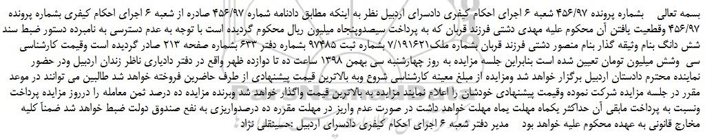 بسمه تعالی بشماره پرونده 456/97 شعبه 6 اجرای احکام کیفری دادسرای اردبیل نظر به اینکه مطابق دادنامه شماره 456/97 صادره از شعبه 6 اجرای احکام کیفری بشماره پرونده 456/97 وقطعیت یافتن آن محکوم علیه مهدی دشتی فرزند قربان که به پرداخت سیصدوپنجاه میلیون ریال محکوم گردیده است با توجه به عدم دسترسی به نامبرده دستور ضبط سند ملکی شش دانگ بنام وثیقه گذار بنام منصور دشتی فرزند قربان بشماره ملک7/191621 بشماره ثبت 97485 بشماره دفتر 633 بشماره صفحه 213 صادر گردیده است وقیمت کارشناسی سی وشش میلیون تومان تعیین شده است بنابراین جلسه مزایده به روز چهارشنبه سی بهمن 1398 ساعت ده تا دوازده ظهر واقع در دفتر دادیاری ناظر زندان اردبیل ودر حضور نماینده محترم دادستان اردبیل برگزار خواهد شد ومزایده از مبلغ معینه کارشناسی شروع وبه بالاترین قیمت پیشنهادی از طرف حاضرین فروخته خواهد شد طالبین می توانند در موعد مقرر در جلسه مزایده شرکت نموده وقیمت پیشنهادی خودشان را اعلام نمایند مزایده به بالاترین قیمت واگذار خواهد شد وبرنده مزایده ده درصد ثمن معامله را درروز مزایده پرداخت ونسبت به پرداخت مابقی آن حداکثر یکماه مهلت یماه مهلت خواهد داشت در صورت عدم واریز در مهلت مقرره ده درصدواریزی به نفع صندوق دولت ضبط خواهد شد ضمنآ کلیه مخارج قانونی به عهده محکوم علیه خواهد بود