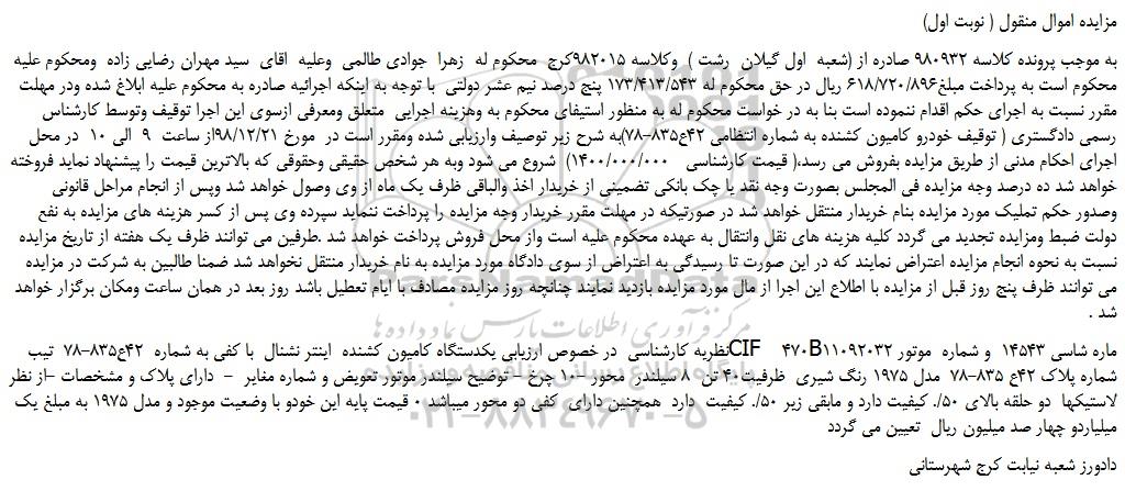 به موجب پرونده کلاسه 980932 صادره از (شعبه  اول گیلان  رشت )  وکلاسه 982015کرج  محکوم له  زهرا  جوادی طالمی  وعلیه  اقای  سید مهران رضایی زاده  ومحکوم علیه محکوم است به پرداخت مبلغ618/720/896 ریال در حق محکوم له 173/413/543 پنج درصد نیم عشر دولتی  با توجه به اینکه اجرائیه صادره به محکوم علیه ابلاغ شده ودر مهلت مقرر نسبت به اجرای حکم اقدام ننموده است بنا به در خواست محکوم له به منظور استیفای محکوم به وهزینه اجرایی  متعلق ومعرفی ازسوی این اجرا توقیف وتوسط کارشناس رسمی دادگستری ( توقیف خودرو کامیون کشنده به شماره انتظامی 42ع835-78)به شرح زیر توصیف وارزیابی شده ومقرر است در  مورخ 98/12/21از ساعت  9  الی 10  در محل اجرای احکام مدنی از طریق مزایده بفروش می رسد،( قیمت کارشناسی   1400/000/000)  شروع می شود وبه هر شخص حقیقی وحقوقی که بالاترین قیمت را پیشنهاد نماید فروخته خواهد شد ده درصد وجه مزایده فی المجلس بصورت وجه نقد یا چک بانکی تضمینی از خریدار اخذ والباقی ظرف یک ماه از وی وصول خواهد شد وپس از انجام مراحل قانونی وصدور حکم تملیک مورد مزایده بنام خریدار منتقل خواهد شد در صورتیکه در مهلت مقرر خریدار وجه مزایده را پرداخت ننماید سپرده وی پس از کسر هزینه های مزایده به نفع دولت ضبط ومزایده تجدید می گردد کلیه هزینه های نقل وانتقال به عهده محکوم علیه است واز محل فروش پرداخت خواهد شد .طرفین می توانند ظرف یک هفته از تاریخ مزایده نسبت به نحوه انجام مزایده اعتراض نمایند که در این صورت تا رسیدگی به اعتراض از سوی دادگاه مورد مزایده به نام خریدار منتقل نخواهد شد ضمنا طالبین به شرکت در مزایده می توانند ظرف پنج روز قبل از مزایده با اطلاع این اجرا از مال مورد مزایده بازدید نمایند چنانچه روز مزایده مصادف با ایام تعطیل باشد روز بعد در همان ساعت ومکان برگزار خواهد شد .
