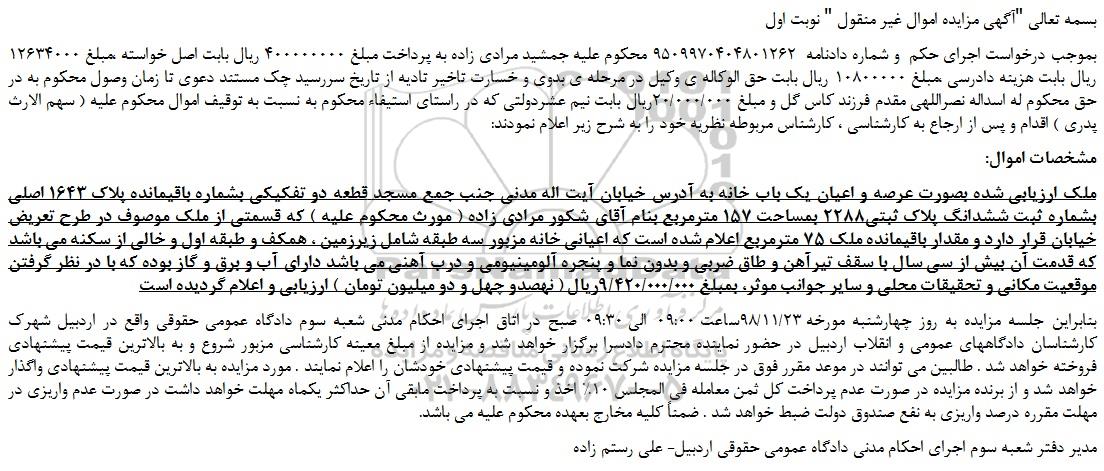 بموجب درخواست اجرای حکم و شماره دادنامه 9509970404801262 محکوم علیه جمشید مرادی زاده به پرداخت مبلغ 400000000 ریال بابت اصل خواسته ،مبلغ 12634000 ریال بابت هزینه دادرسی ،مبلغ 10800000 ریال بابت حق الوکاله ی وکیل در مرحله ی بدوی و خسارت تاخیر تادیه از تاریخ سررسید چک مستند دعوی تا زمان وصول محکوم به در حق محکوم له اسداله نصراللهی مقدم فرزند کاس گل و مبلغ 20/000/000ریال بابت نیم عشردولتی که در راستای استیفاء محکوم به نسبت به توقیف اموال محکوم علیه ( سهم الارث پدری ) اقدام و پس از ارجاع به کارشناسی ، کارشناس مربوطه نظریه خود را به شرح زیر اعلام نمودند: