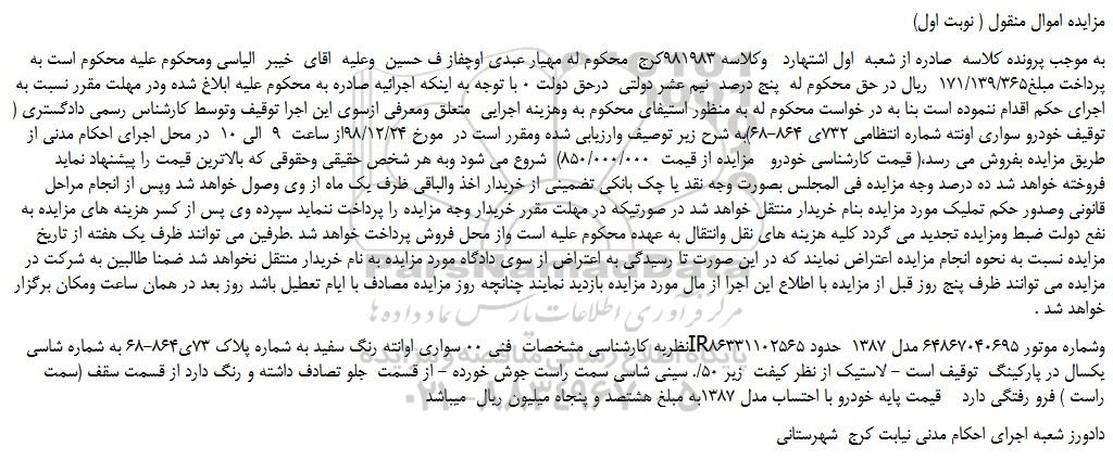 به موجب پرونده کلاسه  صادره از شعبه  اول اشتهارد   وکلاسه 981983کرج  محکوم له مهیار عبدی اوچفاز ف حسین  وعلیه  اقای  خیبر  الیاسی ومحکوم علیه محکوم است به پرداخت مبلغ171/139/365  ریال در حق محکوم له  پنج درصد  نیم عشر دولتی  درحق دولت 0 با توجه به اینکه اجرائیه صادره به محکوم علیه ابلاغ شده ودر مهلت مقرر نسبت به اجرای حکم اقدام ننموده است بنا به در خواست محکوم له به منظور استیفای محکوم به وهزینه اجرایی  متعلق ومعرفی ازسوی این اجرا توقیف وتوسط کارشناس رسمی دادگستری ( توقیف خودرو سواری اونته شماره انتظامی 732ی 864-68)به شرح زیر توصیف وارزیابی شده ومقرر است در  مورخ 98/12/24از ساعت  9  الی 10  در محل اجرای احکام مدنی از طریق مزایده بفروش می رسد،( قیمت کارشناسی خودرو   مزایده از قیمت  850/000/000)  شروع می شود وبه هر شخص حقیقی وحقوقی که بالاترین قیمت را پیشنهاد نماید فروخته خواهد شد ده درصد وجه مزایده فی المجلس بصورت وجه نقد یا چک بانکی تضمینی از خریدار اخذ والباقی ظرف یک ماه از وی وصول خواهد شد وپس از انجام مراحل قانونی وصدور حکم تملیک مورد مزایده بنام خریدار منتقل خواهد شد در صورتیکه در مهلت مقرر خریدار وجه مزایده را پرداخت ننماید سپرده وی پس از کسر هزینه های مزایده به نفع دولت ضبط ومزایده تجدید می گردد کلیه هزینه های نقل وانتقال به عهده محکوم علیه است واز محل فروش پرداخت خواهد شد .طرفین می توانند ظرف یک هفته از تاریخ مزایده نسبت به نحوه انجام مزایده اعتراض نمایند که در این صورت تا رسیدگی به اعتراض از سوی دادگاه مورد مزایده به نام خریدار منتقل نخواهد شد ضمنا طالبین به شرکت در مزایده می توانند ظرف پنج روز قبل از مزایده با اطلاع این اجرا از مال مورد مزایده بازدید نمایند چنانچه روز مزایده مصادف با ایام تعطیل باشد روز بعد در همان ساعت ومکان برگزار خواهد شد .
