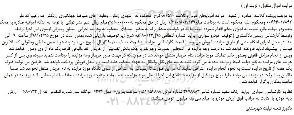 به موجب پرونده کلاسه صادره از شعبه مراغه اذربایجان غربی وکلاسه 981510کرج محکوم له مهدی زمانی وعلیه اقای علیرضا جهانگیری زرنکش ف رحیم کد ملی 00664017842 ومحکوم علیه محکوم است به پرداخت مبلغ1/210/803/149 ریال در حق محکوم له25/000/000ومبلغ ریال نیم عشر دولتی با توجه به اینکه اجرائیه صادره به محکوم علیه ابلاغ شده ودر مهلت مقرر نسبت به اجرای حکم اقدام ننموده است بنا به در خواست محکوم له به منظور استیفای محکوم به وهزینه اجرایی متعلق ومعرفی ازسوی این اجرا توقیف وتوسط کارشناس رسمی دادگستری ( توقیف خودرو سواری پراید شماره انتظامی 95ل133-68)به شرح زیر توصیف وارزیابی شده ومقرر است در مورخ 98/12/25از ساعت 9 الی 10 در محل اجرای احکام مدنی از طریق مزایده بفروش می رسد،( قیمت کارشناسی مزایده از قیمت 390/000/000)ریال شروع می شود وبه هر شخص حقیقی وحقوقی که بالاترین قیمت را پیشنهاد نماید فروخته خواهد شد ده درصد وجه مزایده فی المجلس بصورت وجه نقد یا چک بانکی تضمینی از خریدار اخذ والباقی ظرف یک ماه از وی وصول خواهد شد وپس از انجام مراحل قانونی وصدور حکم تملیک مورد مزایده بنام خریدار منتقل خواهد شد در صورتیکه در مهلت مقرر خریدار وجه مزایده را پرداخت ننماید سپرده وی پس از کسر هزینه های مزایده به نفع دولت ضبط ومزایده تجدید می گردد کلیه هزینه های نقل وانتقال به عهده محکوم علیه است واز محل فروش پرداخت خواهد شد .طرفین می توانند ظرف یک هفته از تاریخ مزایده نسبت به نحوه انجام مزایده اعتراض نمایند که در این صورت تا رسیدگی به اعتراض از سوی دادگاه مورد مزایده به نام خریدار منتقل نخواهد شد ضمنا طالبین به شرکت در مزایده می توانند ظرف پنج روز قبل از مزایده با اطلاع این اجرا از مال مورد مزایده بازدید نمایند چنانچه روز مزایده مصادف با ایام تعطیل باشد روز بعد در همان ساعت ومکان برگزار خواهد شد .