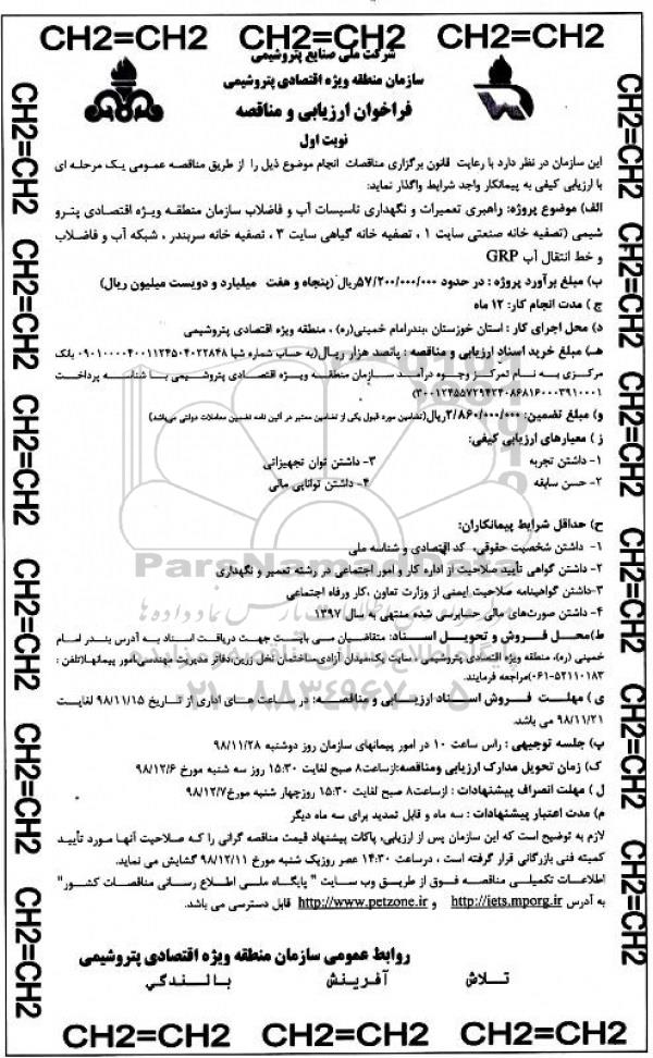 الف- موضوع پروژه: راهبری تعمیرات و نگهداری تاسیسات آب و فاضلاب سازمان منطقه ویژه اقتصادی پتروشیمی تصفیه خانه صنعتی سایت 1 ، تصفیه خانه گیاهی سایت 3 ، تصفیه خانه سربندر ، شبکه آب و فاضلاب و خط انتقال آب GRP