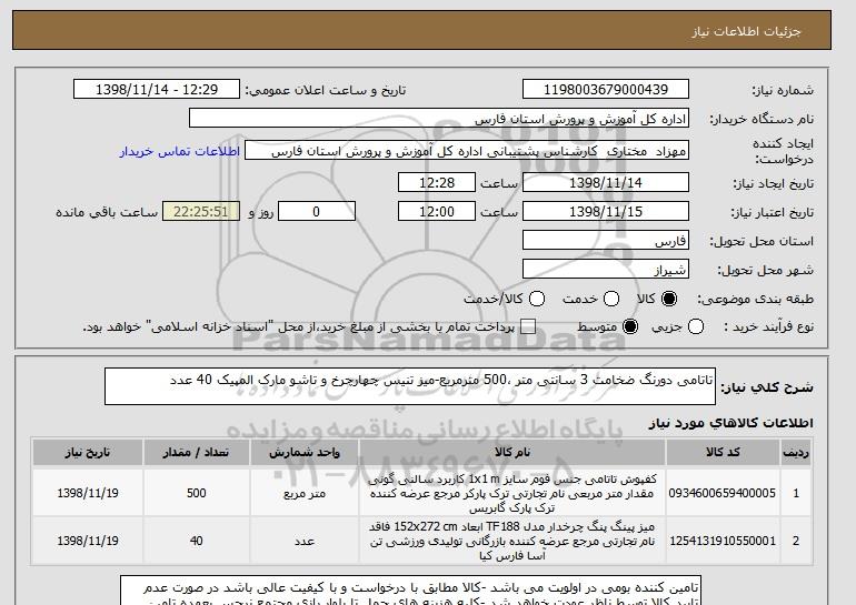 شرح کلی نیاز: تاتامی دورنگ ضخامت 3 سانتی متر ،500 مترمربع-میز تنیس چهارچرخ و تاشو مارک المپیک 40 عدد