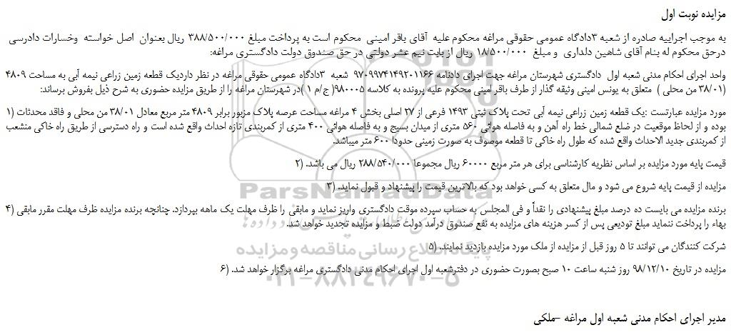 واحد اجرای احکام مدنی شعبه اول دادگستری شهرستان مراغه جهت اجرای دادنامه 9709974149201166 شعبه 3دادگاه عمومی حقوقی مراغه در نظر داردیک قطعه زمین زراعی نیمه آبی به مساحت 4809 (38/01 من محلی ) متعلق به یونس امینی وثیقه گذار از طرف باقر امینی محکوم علیه پرونده به کلاسه 980005( ج/م 1 )در شهرستان مراغه را از طریق مزایده حضوری به شرح ذیل بفروش برساند: