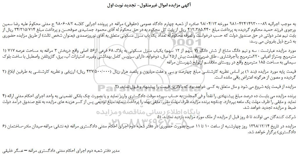 به موجب اجرائیه 9810424149300089 مورخه 98/04/13 صادره از شعبه چهارم دادگاه عمومی (حقوقی) مراغه در پرونده اجرایی کلاسه 980608/2 ج مدنی محکومٌ علیه رضا سمین ورجوی فرزند حمید محکوم گردیده به پرداخت مبلغ 412،385،440 ریال از بابت کل محکوم به در حق محکومٌ له آقای محمود جمشیدی صوفحسن و پرداخت مبلغ 34/315/714 ریال از بابت نیم عشر دولتی در حق صندوق دولت که حسب درخواست و تعرفه محکومٌ له تعداد یک باب منزل مسکونی متعلق به آقای نوروزصمدی (بعنوان شخص ثالث) از طریق مزایده حضوری به شرح ذیل بفروش می رسد: