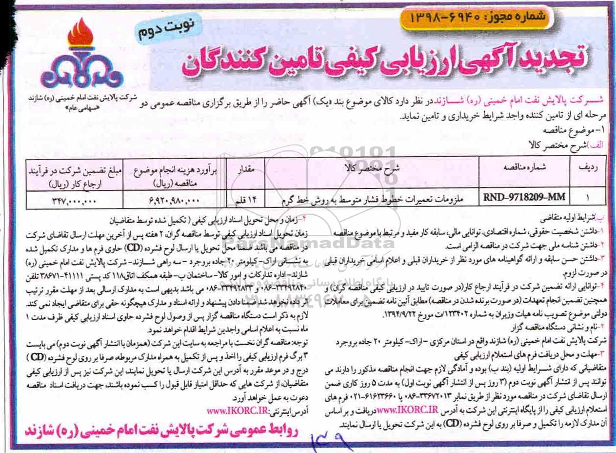 ارزیابی کیفی تجدید ملزومات تعمیرات خطوط فشار متوسط - نوبت دوم , تجدید ارزیابی کیفی , ارزیابی کیفی تجدید ملزومات تعمیرات خطوط فشار متوسط - نوبت دوم