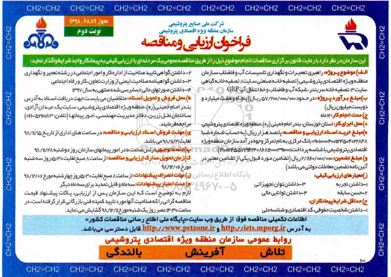 اطلاعات تکمیلی مناقصه فوق از طریق وب سایت پایگاه ملی اطلاع رسانی مناقصه کشور به آدرس HTTP://IETS.MPORG.IR و HTTP://WWW.PETZONE.IR قابل دسترسی می باشد.