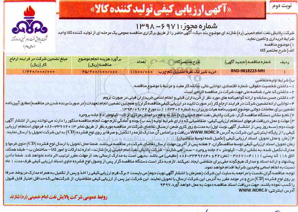 شرکت پالایش نفت امام خمینی (ره) شازند موضوع بند یک آگهی حاضر را از طریق برگزاری مناقصه عمومی یک مرحله ای از تولید کننده کالا واجد شرایط خریداری و تامین نماید.