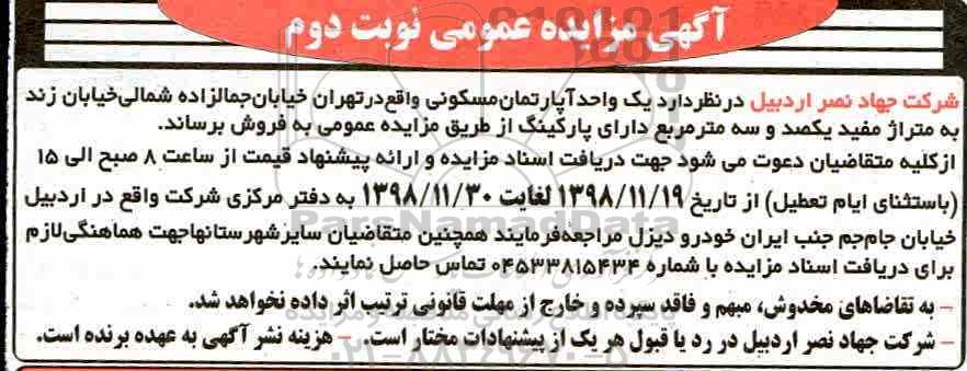 مزایده فروش یک واحد آپارتمان مسکونی نوبت دوم