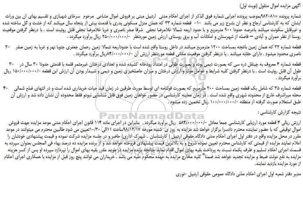 شماره پرونده =982081بموجب پرونده اجرایی شماره فوق الذکر از اجرای احکام مدنی اردبیل مبنی بر فروش اموال مشاعی مرحوم سرخای شهبازی و تقسیم بهای ان بین وراث ایشان که به کارشناسی ارجاع و نظر ان بشرح زیر می باشد -1- قطعه شماره 33 که همان منزل مسکونی پدری با قدمت بیش از پنجاه سال میباشد که از خشت و گل ساخته شده و غیرقابل سکونت میباشد باعرصه حدودا 900 مترمربع و با حدود اربعه شمالا غلامرضا نجفی شرقا صفر ناصری و غربا غلامرضا نجفی قابل روئیت است . با درنظر گرفتن موقعیت روستا از نظر عمران و آبادی – فاصله از شهرستان و امکانات آب و برق روستای ارزش زمین موردنظر -/250/000/000 ریال برآورد میگردد .