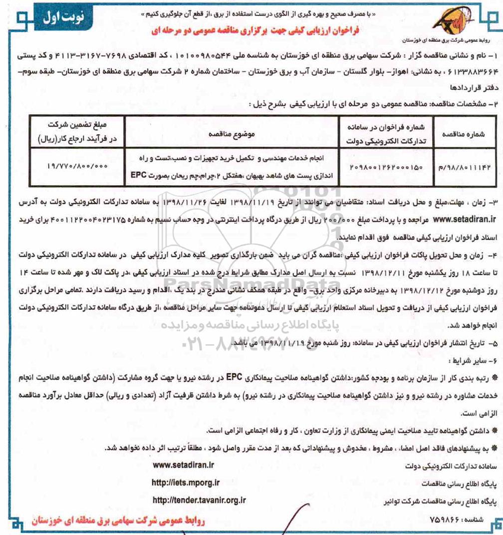98/8011143/ م  2098001262000150 انجام خدمات مهندسی و تکمیل خرید تجهیزات و نصب، تست و راه اندازی پست های شاهد بهبهان، هفتکل 2، چرام، چم ریحان، به صورت EPC