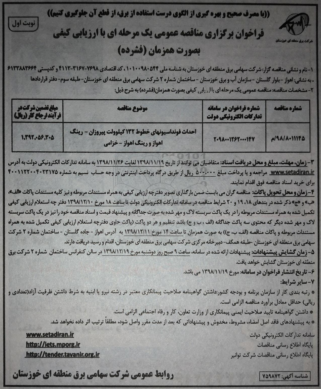 98/8011145/م 2098001262000147 احداث فونداسیون های خطووط 132 کیلوولت پیروزان - رینگ اهواز و رینگ اهواز - خزامی