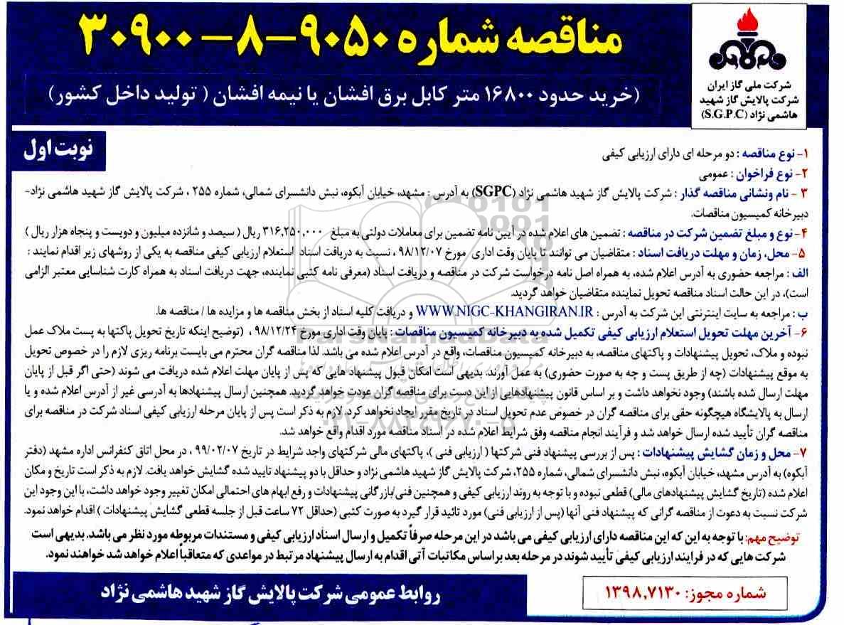 7- محل و زمان گشایش پیشنهادات: پس از بررسی پیشنهاد فنی شرکتها (ارزیابی فنی)، پاکتهای مالی شرکتهای واجد شرایط در تاریخ 99.2.24، در محل اتاق کنفرانس اداره مشهد (دفتر آبکوه) به آدرس مشهد، خیابان آبکوه، نبش دانشسرای شمالی، شماره 255، شرکت پالایش گاز شهید هاشمی نژاد و حداقل با دو پیشنهاد تأیید شده گشایش خواهد یافت. لازم به ذکر است تاریخ و مکان اعلام شده (تاریخ گشایش پیشنهادهای مالی) قطعی نبوده و با توجه به روند ارزیابی کیفی و همچنین فنی/بازرگانی پیشنهادات و رفع ابهام های احتمالی امکان تغییر وجود خواهد داشت، با این وجود این شرکت نسبت به دعوت از مناقصه گرانی که پیشنهاد فنی آنها (پس از ارزیابی فنی) مورد تأیید قرار گیرد به صورت کتبی (حداقل 72 ساعت قبل از جلسه قطعی گشایش پیشنهادات) اقدام خواهد نمود.