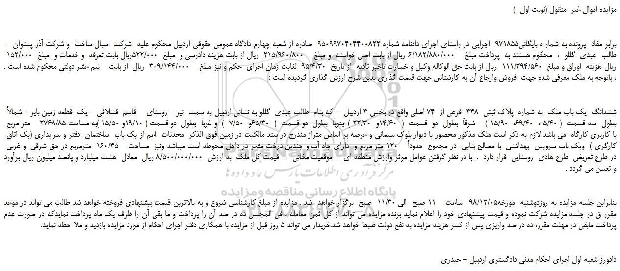 برابر مفاد  پرونده به شمار ه بایگانی971855  اجرایی در راستای اجرای دادنامه شماره 9509970404400822  صادره از شعبه چهارم دادگاه عمومی حقوقی اردبیل محکوم علیه  شرکت  سیال ساخت  و شرکت آذر پستوان  - طالب  عبدی  گللو  ،  محکوم هستند به  پرداخت مبلغ    6/182/880/000 ریال از بابت اصل خواسته  و مبلغ    215/960/800  ریال از بابت هزینه دادرسی و  مبلغ  522/000ریال بابت تعرفه  و خدمات و  مبلغ  152/000  ریال هزینه  اوراق و مبلغ  111/394/560  ریال از بابت حق الوکاله وکیل و خسارت تاخیر تادیه  از تاریخ  95/4/30  لغایت زمان اجرای  حکم و نیز مبلغ    309/144/000  ریال  از بابت    نیم عشر دولتی محکوم شده است . ، باتوجه به ملک معرفی شده جهت  فروش وارجاع آن به کارشناس جهت قیمت گذاری بدین شرح ارزش گذاری گردیده است :