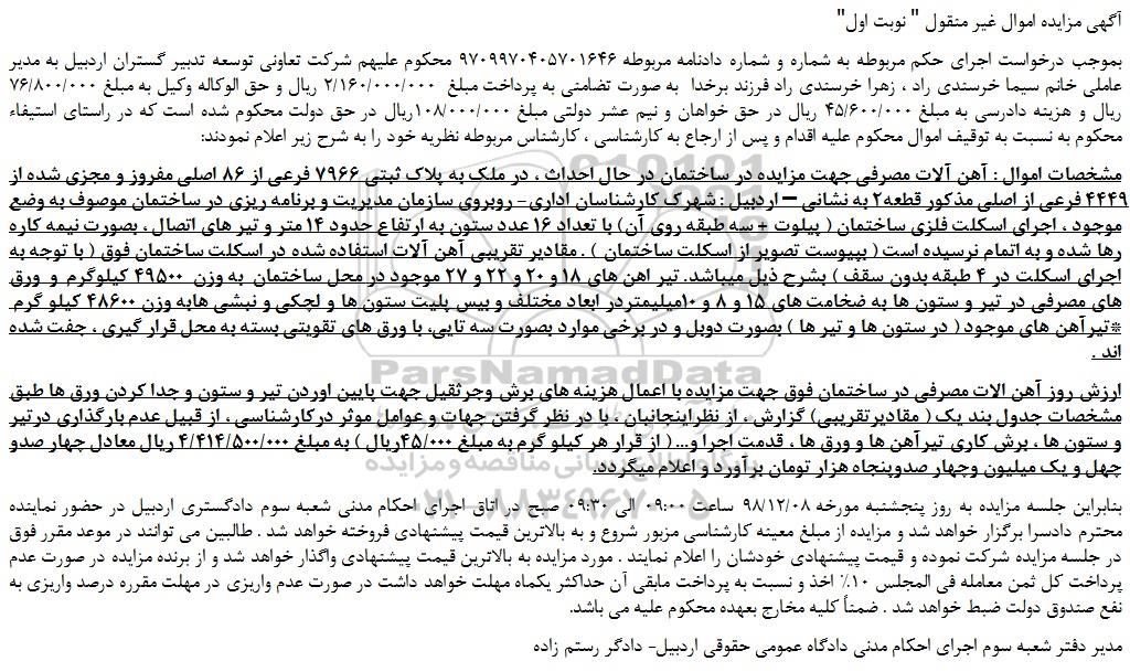 مشخصات اموال : آهن آلات مصرفی جهت مزایده در ساختمان در حال احداث ، در ملک به پلاک ثبتی 7966 فرعی از 86 اصلی مفروز و مجزی شده از 4449 فرعی از اصلی مذکور قطعه2 به نشانی – اردبیل : شهرک کارشناسان اداری- روبروی سازمان مدیریت و برنامه ریزی در ساختمان موصوف به وضع موجود ، اجرای اسکلت فلزی ساختمان ( پیلوت + سه طبقه روی آن) با تعداد 16 عدد ستون به ارتفاع حدود 14 متر و تیر های اتصال ، بصورت نیمه کاره رها شده و به اتمام نرسیده است ( بپیوست تصویر از اسکلت ساختمان ) . مقادیر تقریبی آهن آلات استفاده شده در اسکلت ساختمان فوق ( با توجه به اجرای اسکلت در 4 طبقه بدون سقف ) بشرح ذیل میباشد. تیر اهن های 18 و 20 و 22 و 27 موجود در محل ساختمان به وزن 49500 کیلوگرم و ورق های مصرفی در تیر و ستون ها به ضخامت های 15 و 8 و 10میلیمتردر ابعاد مختلف و بیس پلیت ستون ها و لچکی و نبشی هابه وزن 48600 کیلو گرم *تیرآهن های موجود ( در ستون ها و تیر ها ) بصورت دوبل و در برخی موارد بصورت سه تایی، با ورق های تقویتی بسته به محل قرار گیری ، جفت شده اند .