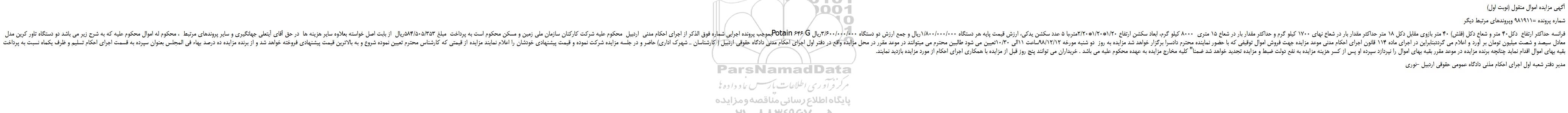 بموجب پرونده اجرایی شماره فوق الذکر از اجرای احکام مدنی اردبیل محکوم علیه شرکت کارکنان سازمان ملی زمین و مسکن محکوم است به پرداخت مبلغ 584/505/353ریال از بابت اصل خواسته بعلاوه سایر هزینه ها در حق آقای آیتعلی جهانگیری و سایر پروندهای مرتبط ، محکوم له اموال محکوم علیه که به شرح زیر می باشد دو دستگاه تاور کرین مدل Potain 646 G فرانسه حداکثر ارتفاع دکل40 متر و شعاع دکل (فلش) 40 متر بازوی مقابل دکل 18 متر حداکثر مقدار بار در شعاع نهای 1700 کیلو گرم و حداکثر مقدار بار در شعاع 15 متری 8000 کیلو گرم، ابعاد سکشن ارتفاع 1/20*1/20*2/20متر،با 5 عدد سکشن یدکی، ارزش قیمت پایه هر دستگاه 1/800/000/000ریال و جمع ارزش دو دستگاه 3/600/000/000ریال معادل سیصد و شصت میلیون تومان بر آورد و اعلام می گرددبنابراین در اجرای ماده 114 قانون اجرای احکام مدنی موعد مزایده جهت فروش اموال توقیفی که با حضور نماینده محترم دادسرا برگزار خواهد شد مزایده به روز دو شنبه مورخه 98/12/12ساعت 11الی 10/30تعیین می شود طالبین محترم می میتوانند در موعد مقرر در محل مزایده واقع در دفتر اول اجرای احکام مدنی دادگاه حقوقی اردبیل ( کارشناسان ـ شهرک اداری) حاضر و در جلسه مزایده شرکت نموده و قیمت پیشنهادی خودشان را اعلام نمایند مزایده از قیمتی که کارشناس محترم تعیین نموده شروع و به بالاترین قیمت پیشنهادی فروخته خواهد شد و از برنده مزایده ده درصد بهاء فی المجلس بعنوان سپرده به قسمت اجرای احکام تسلیم و ظرف یکماه نسبت به پرداخت بقیه بهای اموال اقدام نماید چنانچه برنده مزایده در موعد مقرر بقیه بهای اموال را نپردازد سپرده او پس از کسر هزینه مزایده به نفع دولت ضبط و مزایده تجدید خواهد شد ضمنا" کلیه مخارج مزایده به عهده محکوم علیه می باشد . خریداران می توانند پنج روز قبل از مزایده با همکاری اجرای احکام از مورد مزایده بازدید نمایند.