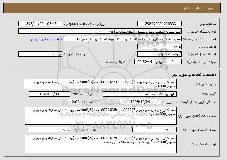 مشخصات کالای مورد نیاز: دستکش جراحی بدون پودر 7(8000عدد)7.5(10000عدد)8(4000عدد)ودستکش معاینه بدون پودر مدیوم(4000عدد)
