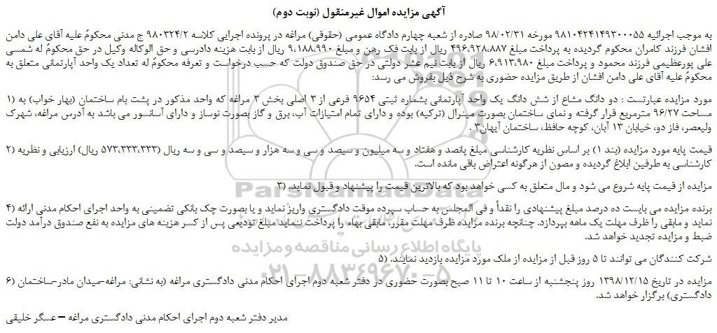 به موجب اجرائیه 9810424149300055 مورخه 98/02/31 صادره از شعبه چهارم دادگاه عمومی (حقوقی) مراغه در پرونده اجرایی کلاسه 980324/2 ج مدنی محکومٌ علیه آقای علی دامن افشان فرزند کامران محکوم گردیده به پرداخت مبلغ 496،928،887 ریال از بابت فک رهن و مبلغ 9،188،990 ریال از بابت هزینه دادرسی و حق الوکاله وکیل در حق محکومٌ له شمسی علی پورعظیمی فرزند محمود و پرداخت مبلغ 6،913،980 ریال از بابت نیم عشر دولتی در حق صندوق دولت که حسب درخواست و تعرفه محکومٌ له تعداد یک واحد آپارتمانی متعلق به محکومٌ علیه آقای علی دامن افشان از طریق مزایده حضوری به شرح ذیل بفروش می رسد: