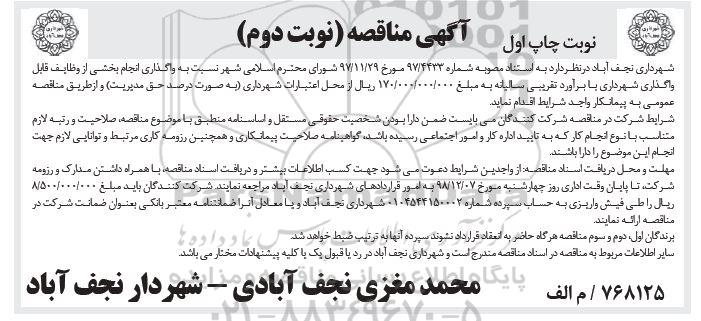 شهرداری نجف آباد در نظر دارد نسبت به واگذاری انجام بخشی از وظایف قابل واگذاری شهرداری با برآورد تقریبی سالیانه به مبلغ 170.000.000.000 ریال از محل اعتبارات شهرداری به صورت درصد حق مدیریت و از طریق مناقصه عمومی به پیمانکار واجد شرایط اقدام نماید