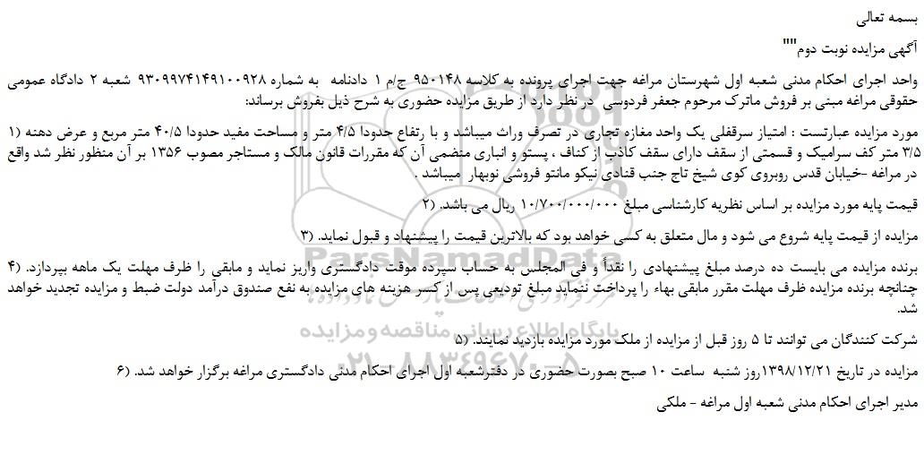 واحد اجرای احکام مدنی شعبه اول شهرستان مراغه جهت اجرای پرونده به کلاسه 950148 ج/م 1 دادنامه به شماره 9309974149100928 شعبه 2 دادگاه عمومی حقوقی مراغه مبنی بر فروش ماترک مرحوم جعفر فردوسی در نظر دارد از طریق مزایده حضوری به شرح ذیل بفروش برساند: