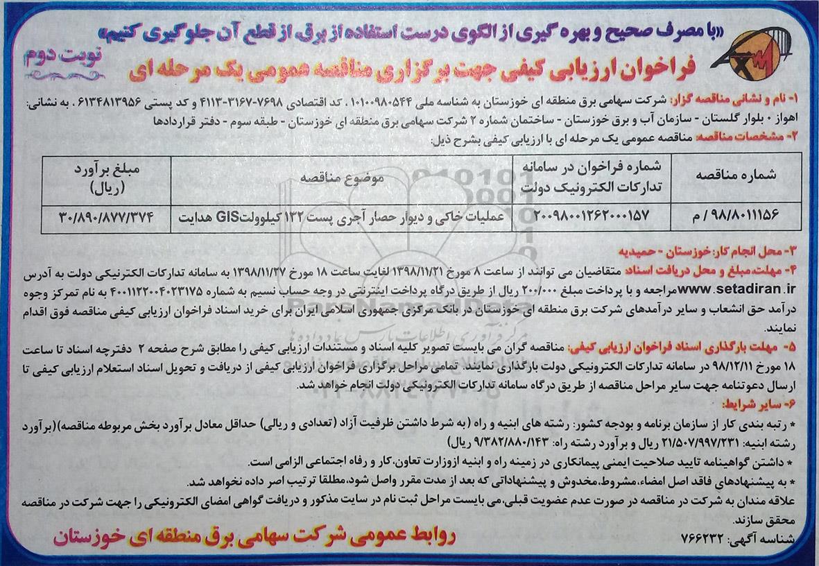 موضوع مناقصه: عملیات خاکی و دیوار حصار آجری پست 132 کیلوولت gis هدایت