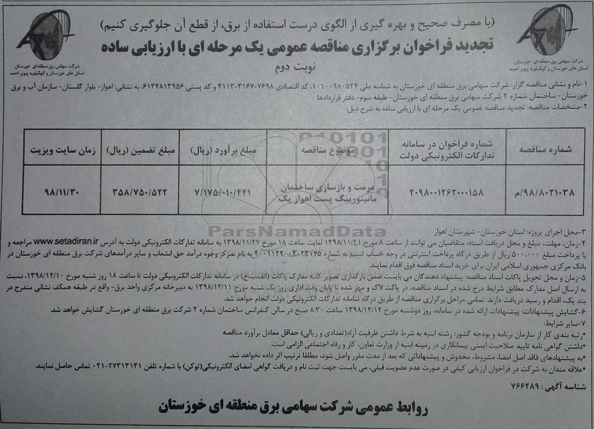 98/8021038/م 2098001262000158  مرمت و بازسازی ساختمان مانیتورینگ پست اهواز یک