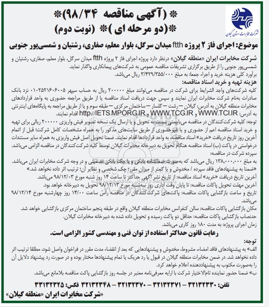 شرکت مخابرات ایران (منطقه گیلان) در نظر دارد پروژه اجرای فاز 2 پروژه ftth میدان سرگل ، بلوار معلم ، صفاری ، رشتیان و شمسی پور جنوبی را از طریق برگزاری تشریفات مناقصه عمومی به شرکتهای پیمانکاری واگذار نماید