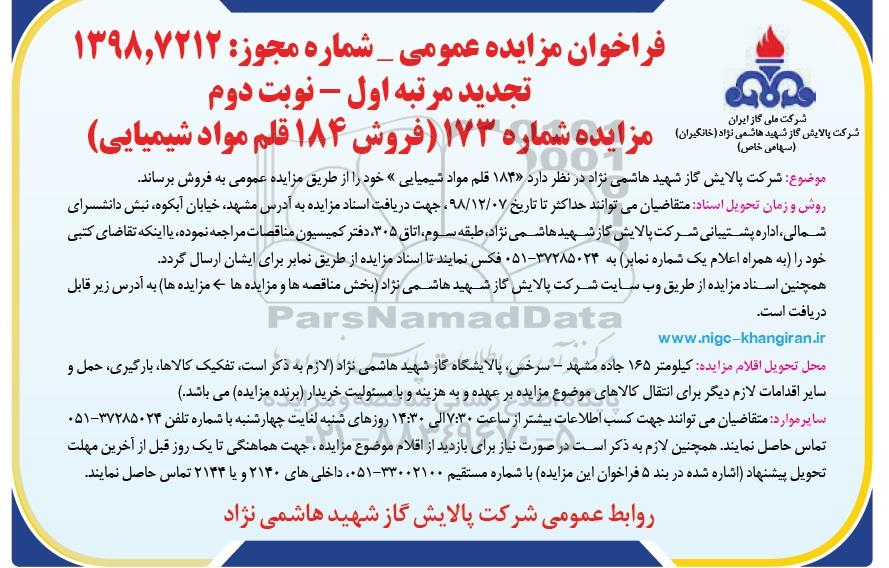 موضوع: شركت پالایش گاز شهید هاشمی نژاد در نظر دارد فروش 184 قلم مواد شیمیایی خود را از طریق مزایده عمومی به فروش برساند