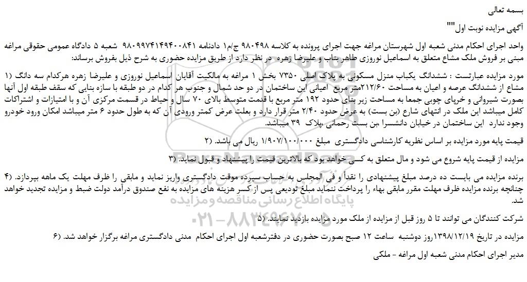 واحد اجرای احکام مدنی شعبه اول شهرستان مراغه جهت اجرای پرونده به کلاسه 980498 ج/م1 دادنامه 9809974149400841  شعبه 5 دادگاه عمومی حقوقی مراغه مبنی بر فروش ملک مشاع متعلق به اسماعیل نوروزی طاهر بناب و علیرضا زهره  در نظر دارد از طریق مزایده حضوری به شرح ذیل بفروش برساند: