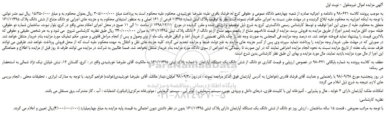به موجب پرونده کلاسه 980621 و دادنامه و اجرائیه صادره از شعبه چهاردهم دادگاه عمومی و حقوقی کرج له: فرشاد باقری علیه: علیرضا خورشیدی. محکوم علیه محکوم است به پرداخت مبلغ 305/000/000 ریال بعنوان محکوم به و مبلغ 15/250/000 ریال نیم عشر دولتی. با توجه به اینکه اجراییه به محکوم علیه ابلاغ گردیده و در مهلت مقرر نسبت به اجرای حکم اقدام ننموده است نظر به توقیف پلاک ثبتی شماره 11495 فرعی از 161 اصلی و به منظور استیفای محکوم به و هزینه های اجرایی دو دانگ مشاع از شش دانگ پلاک 161/11495 متعلق به محکوم علیه از سوی این اجرا توقیف و توسط کارشناس رسمی دادگستری کرج به شرح ذیل توصیف و ارزیابی شده و مقرر گردیده در مورخ 1398/12/11 از ساعت 10 الی 11 صبح در محل اجرای احکام مدنی واقع در کرج، بلوار نبوت، ساختمان شماره دو حقوقی، طبقه سوم، اتاق مزایده (مدیر اجرا) از طریق مزایده به فروش برسد. مزایده از قیمت 8/5سهم مشاع از یکصد سهم مشاع از دو دانگ از 6 دانگ پلاک ثبتی 161/11495 به میزان 340/000/000 ریال طبق نظریه کارشناسی شروع می شود و به هر شخص حقیقی و حقوقی که بالاترین قیمت را پیشنهاد نماید فروخته خواهد شد. ده درصد وجه مزایده فی المجلس به صورت وجه نقد یا چک بانکی تضمینی از خریدار اخذ و الباقی ظرف یک ماه از وی وصول و پس از انجام مراحل قانونی و صدور حکم تملیک مورد مزایده بنام خریدار منتقل خواهد شد. در صورتی که در مهلت مقرر خریدار وجه مزایده را پرداخت ننماید سپرده وی پس از کسر هزینه های مزایده به نفع دولت ضبط و مزایده تجدید می گردد. کلیه هزینه های نقل و انتقال به عهده محکوم علیه است که از محل فروش پرداخت خواهد شد. طرفین می توانند ظرف مدت یک هفته از تاریخ مزایده نسبت به نحوه انجام مزایده اعتراض نمایند که در این صورت تا رسیدگی به اعتراض از سوی دادگاه مورد مزایده بنام خریدار منتقل نخواهد شد. ضمنا طالبین به شرکت در مزایده می توانند ظرف 5 روز قبل از مزایده با اطلاع و هماهنگی این اجرا از مال مورد مزایده بازدید نمایند. مال مورد مزایده و بهای آن طبق نظر کارشناس بدین شرح است: