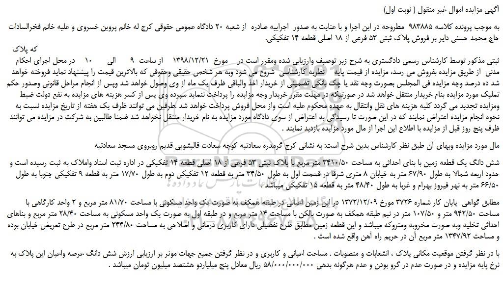 به موجب پرونده کلاسه 983885  مطروحه در این اجرا و با عنایت به صدور  اجراییه صادره  از شعبه 20 دادگاه عمومی حقوقی کرج له خانم پروین خسروی و علیه خانم فخرالسادات حاج محمد حسنی دایر بر فروش پلاک ثبتی 53 فرعی از 18 اصلی قطعه 14 تفکیکی.                                                                                                                                                                                                                                                           که پلاک ثبتی مذکور توسط کارشناس رسمی دادگستری به شرح زیر توصیف وارزیابی شده ومقرر است در    مورخ  1398/12/21    از ساعت  9      الی      10    در محل اجرای احکام  مدنی  از طریق مزایده بفروش می رسد، مزایده از قیمت پایه    نظریه کارشناسی  شروع می شود وبه هر شخص حقیقی وحقوقی که بالاترین قیمت را پیشنهاد نماید فروخته خواهد شد ده درصد وجه مزایده فی المجلس بصورت وجه نقد یا چک بانکی تضمینی از خریدار اخذ والباقی ظرف یک ماه از وی وصول خواهد شد وپس از انجام مراحل قانونی وصدور حکم تملیک مورد مزایده بنام خریدار منتقل خواهد شد در صورتیکه در مهلت مقرر خریدار وجه مزایده را پرداخت ننماید سپرده وی پس از کسر هزینه های مزایده به نفع دولت ضبط ومزایده تجدید می گردد کلیه هزینه های نقل وانتقال به عهده محکوم علیه است واز محل فروش پرداخت خواهد شد .طرفین می توانند ظرف یک هفته از تاریخ مزایده نسبت به نحوه انجام مزایده اعتراض نمایند که در این صورت تا رسیدگی به اعتراض از سوی دادگاه مورد مزایده به نام خریدار منتقل نخواهد شد ضمنا طالبین به شرکت در مزایده می توانند ظرف پنج روز قبل از مزایده با اطلاع این اجرا از مال مورد مزایده بازدید نمایند .