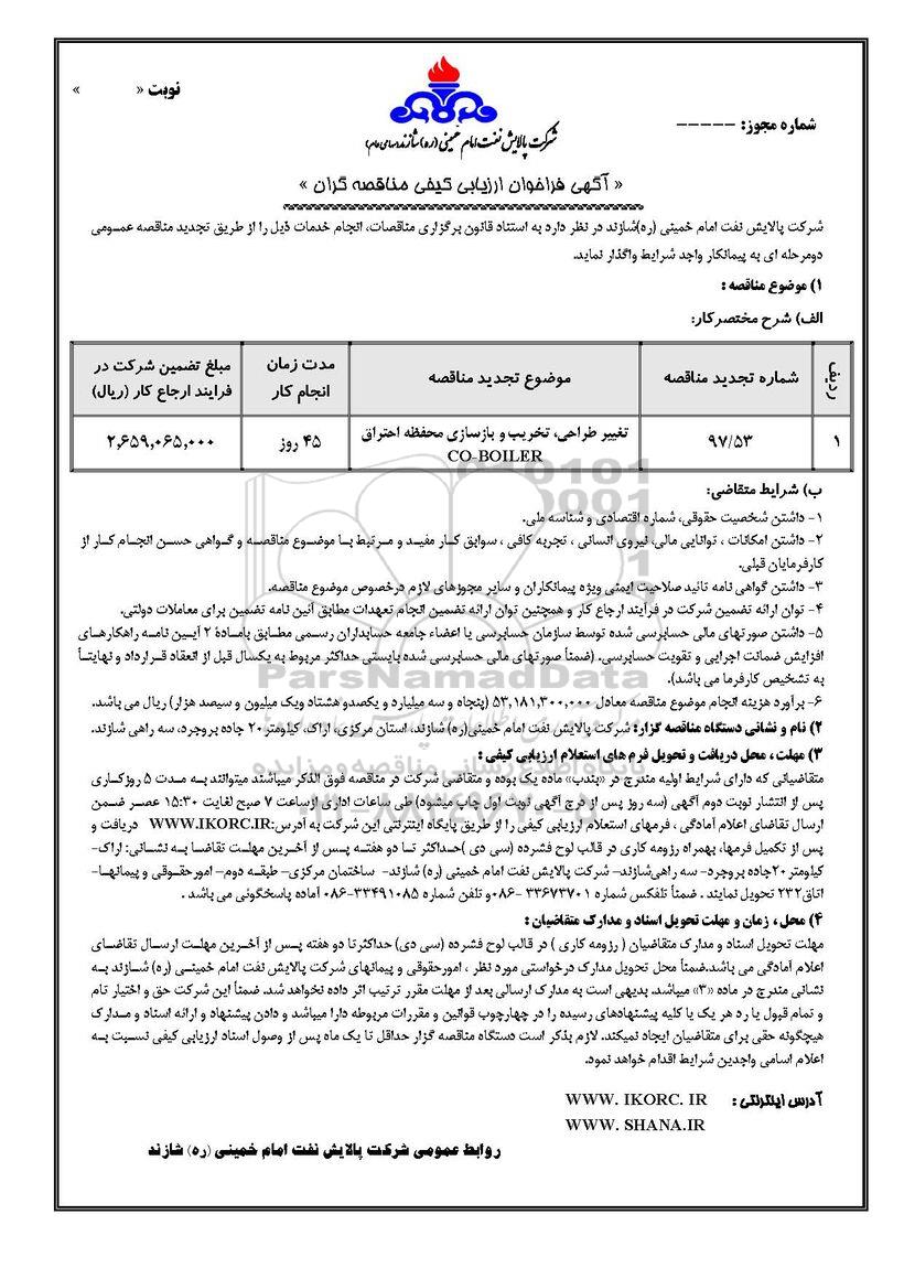 | 97/53 | تغییرات طراحی تخریب و بازسازی محفظه احتراق CO-BOILER | 45 روز | 2.659.065.000 |