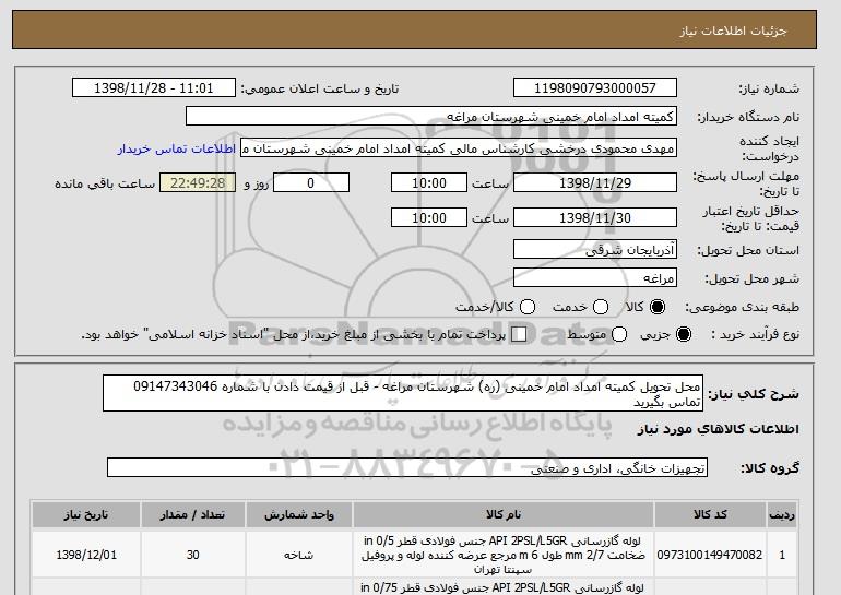 شرح کلی نیاز: محل تحویل کمیته امداد امام خمینی (ره) شهرستان مراغه - قبل از قیمت دادن با شماره 09147343046 تماس بگیرید