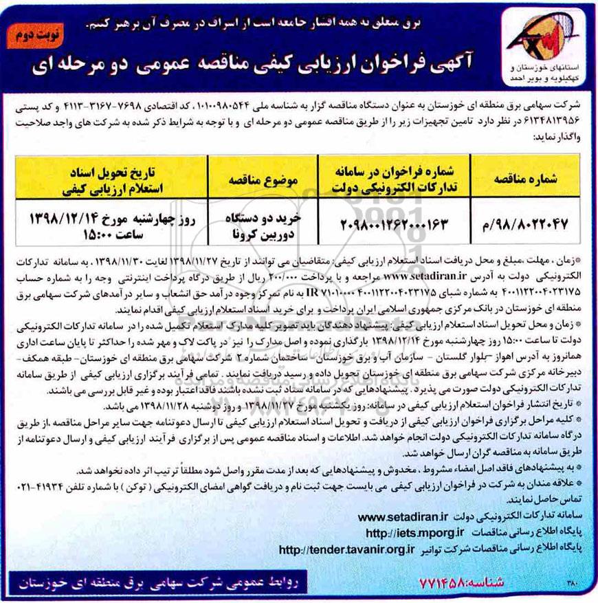 | 98/8022047 / م | 20098001262000163 | خرید دو دستگاه دوربین کرونا | روز چهارشنبه مورخ 98.12.14 ساعت 15 |