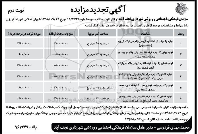 سازمان فرهنگی، اجتماعی و ورزشی شهرداری نجف آباد در نظر دارد اماکن زیر را با شرایط و مشخصات موجود از طریق مزایده به افراد واجد شرایط واگذار ننماید