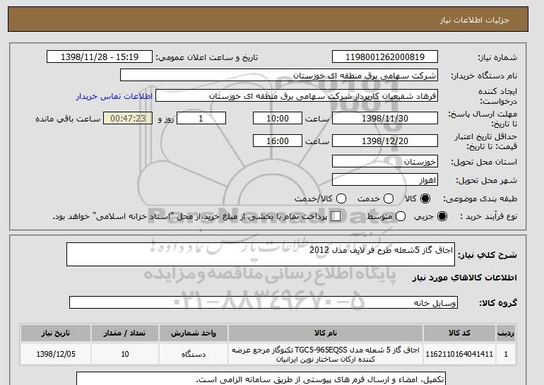 شرح کلی نیاز: اجاق گاز 5شعله طرح فر لایف مدل 2012